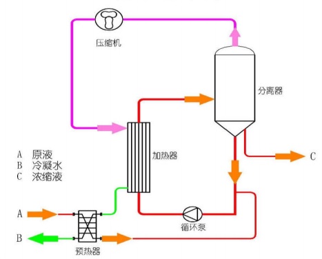 機(jī)械式蒸汽再壓縮MVR蒸發(fā)器利用蒸發(fā)器中產(chǎn)生的二次蒸汽,經(jīng)壓縮機(jī)壓縮,壓力、溫度升高,熱焓增加,然后送到蒸發(fā)器的加熱室當(dāng)作加熱蒸汽使用,使料液維持沸騰狀態(tài),而加熱蒸汽本身則冷凝成水。這樣,原來要廢棄的蒸汽就得到了充分的利用,回收了潛熱,又提高了熱效率,生蒸汽的經(jīng)濟(jì)性相當(dāng)于多效蒸發(fā)的30效,減少了對外部加熱及冷卻資源的需求,降低能耗,減少污染。