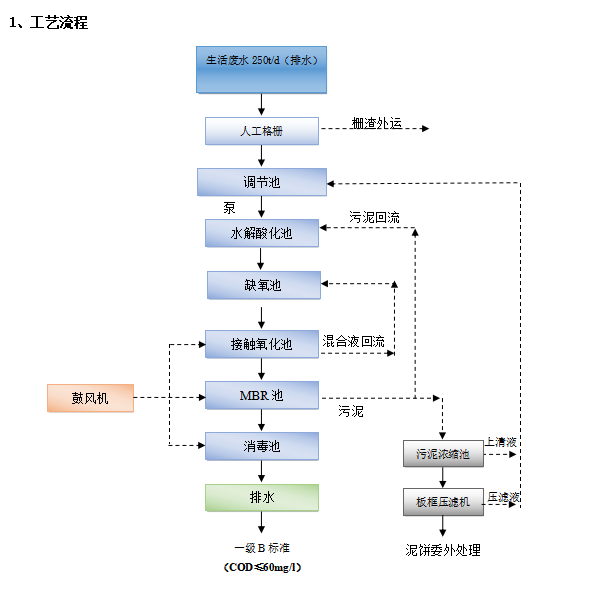 生活污水先經過人工格柵,將大型的懸浮物和物塊隔離出來,剩余的廢水進去調節(jié)池,然后加藥進行處理,在經過MBR池處理,處理后的水在經過消毒,就可以達標排放了。