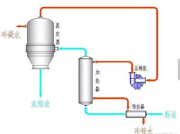 MVR蒸發器采用壓縮機提高二次蒸汽的能量,并對提高能量的二次蒸汽加以利用,回收二次蒸汽的潛熱。具體為:將蒸發器產生的二次蒸汽,通過壓縮機的絕熱壓縮,使其壓力、溫度提高后,再作為加熱蒸汽送入蒸發器的加熱室,冷凝放熱,因此蒸汽的潛熱得到了回收利用。冷料在進入蒸發器前,通過熱交換器吸收了冷凝水的熱量,使之溫度升高,同時也冷卻了冷凝液和完成液,進一步提高熱的利用率。